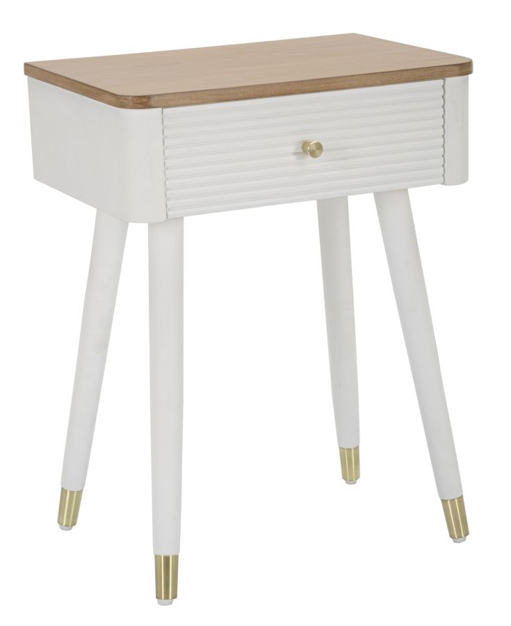 Comodino in legno bianco dalle linee semplici ed essenziali. Completo di cassetto e piano in legno marrone. La maniglia e i piedini in metallo dorato donano un tocco di classe.