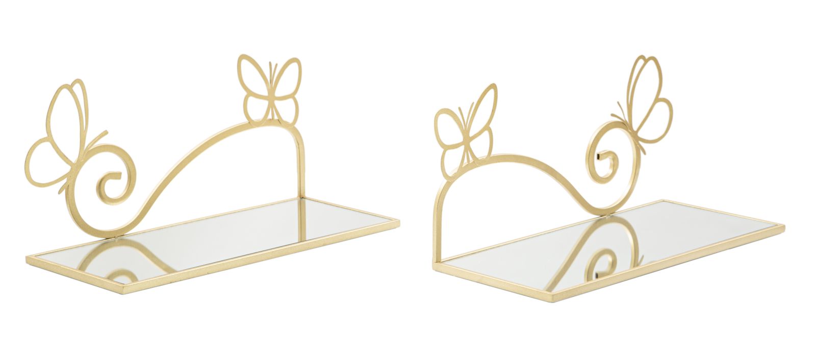 Elegante coppia di mensole da parete in metallo dorato con ripiano in vetro a specchio dalle linee morbide e sinuose impreziosite da farfalle decorative. Il metallo color oro dona un tocco di classe e linee geometriche e arrotondate si sposano perfettamente con ogni tipo di arredo.