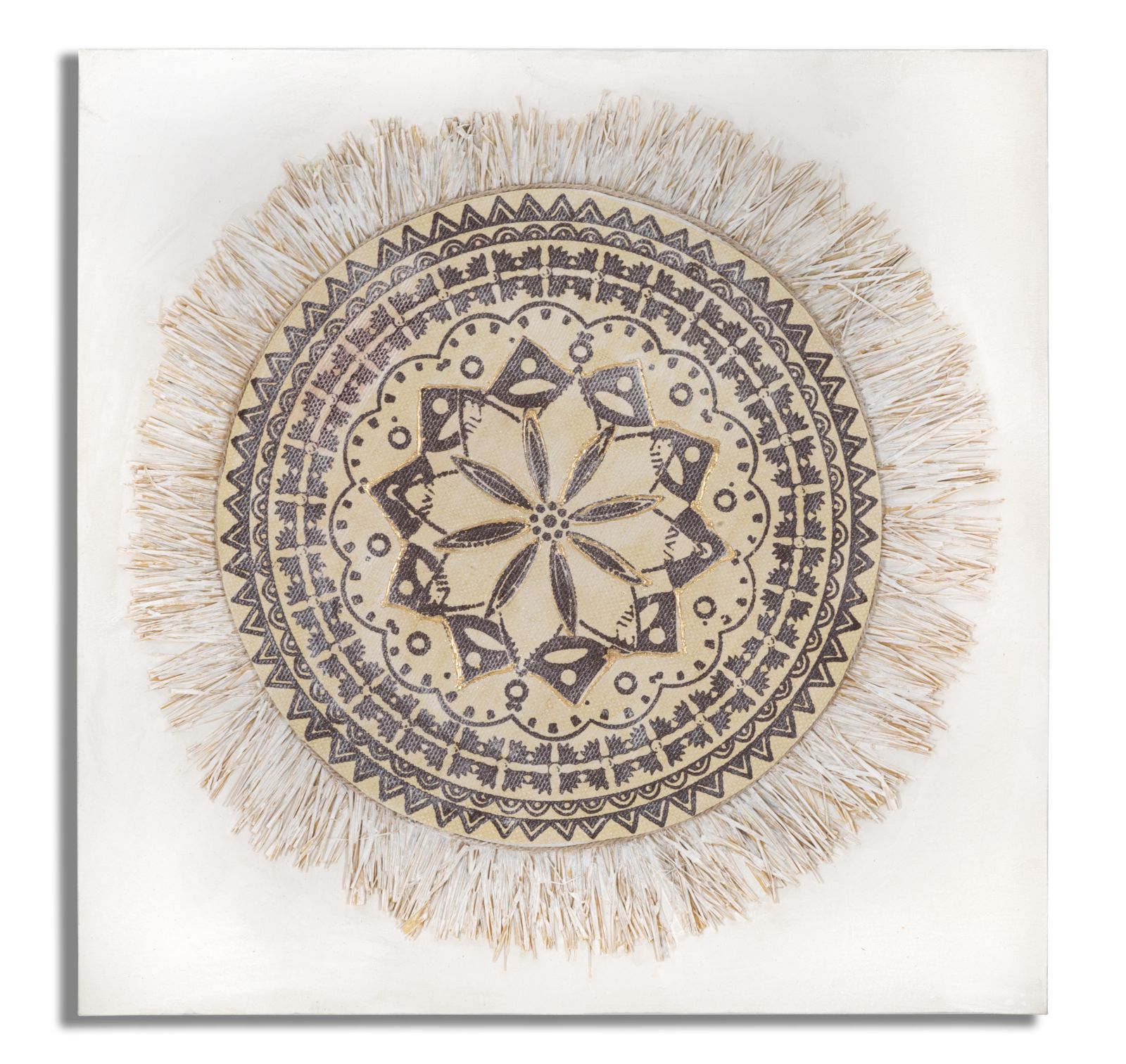 Dipinto su tela completo di telaio arricchito da eleganti decorazioni in rilievo che formano motivi geometrici dai toni caldi e avvolgenti.