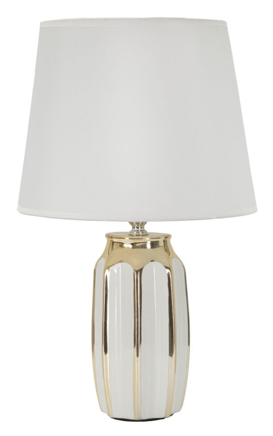 Lampada da tavolo in ceramica bianca e dorata dal design geometrico e dalle linee arrotondate. Completa di paralume in tessuto bianco.