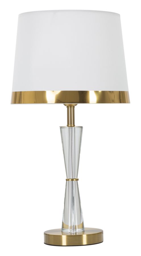Lampada da tavolo in metallo dorato con elegante decorazione trasparente e con base rotonda. Completa di paralume in tessuto bianco con bordi dorati.