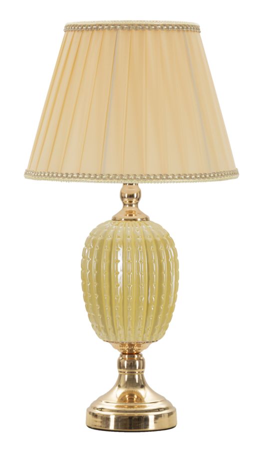 Elegante lampada da tavolo in metallo dorato con applicazioni beige. Completa di paralume in tessuto beige con finiture dorate.