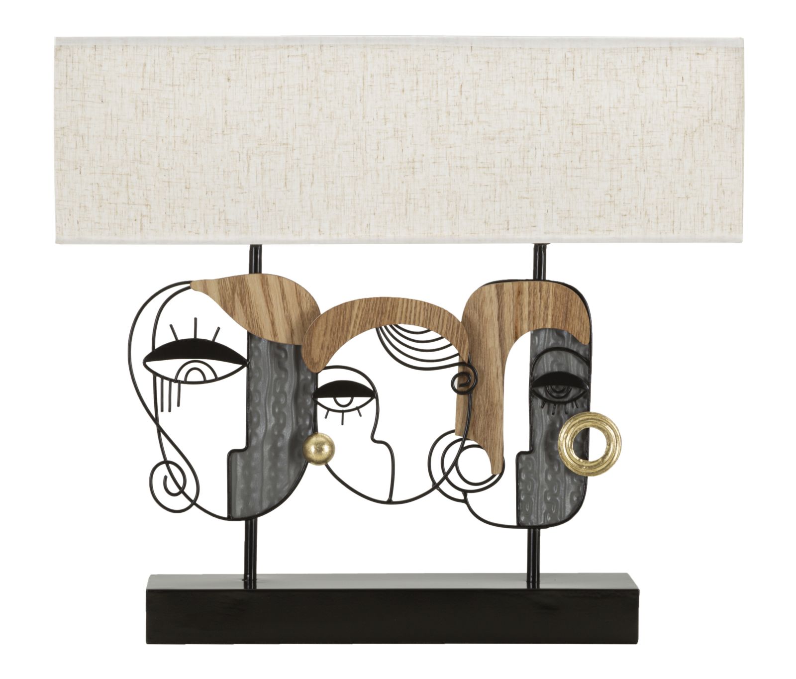 Lampada da tavolo con 2 punti luce in metallo e legno impreziosita da volti che richiamano l’arte cubista. Completa di paralume in tessuto bianco.