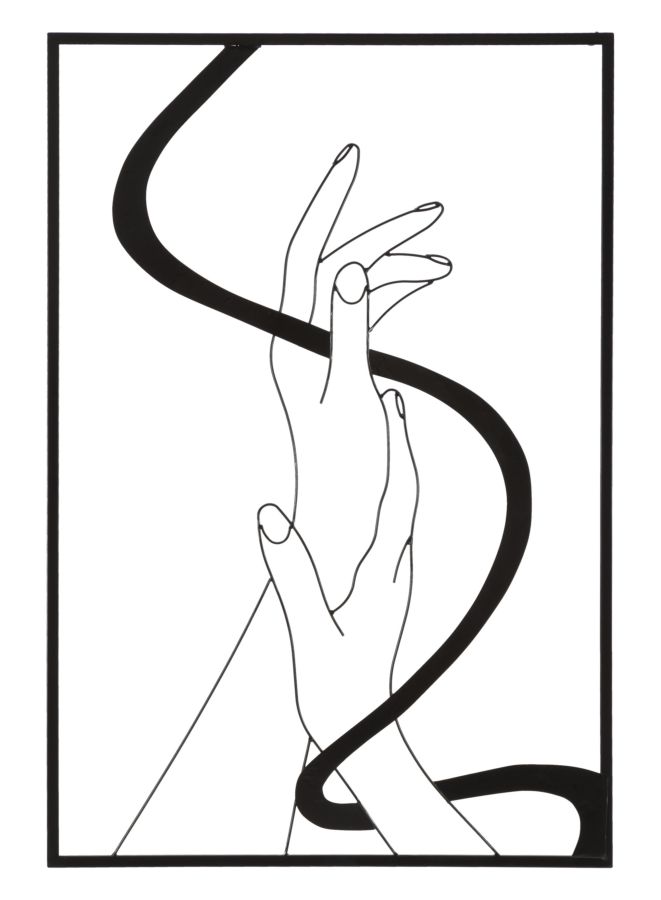 Pannello decorativo 3D da parete dai tratti semplici ed essenziali che vanno a comporre due mani avvolte da un nastro, il tutto racchiuso in una cornice rettangolare.