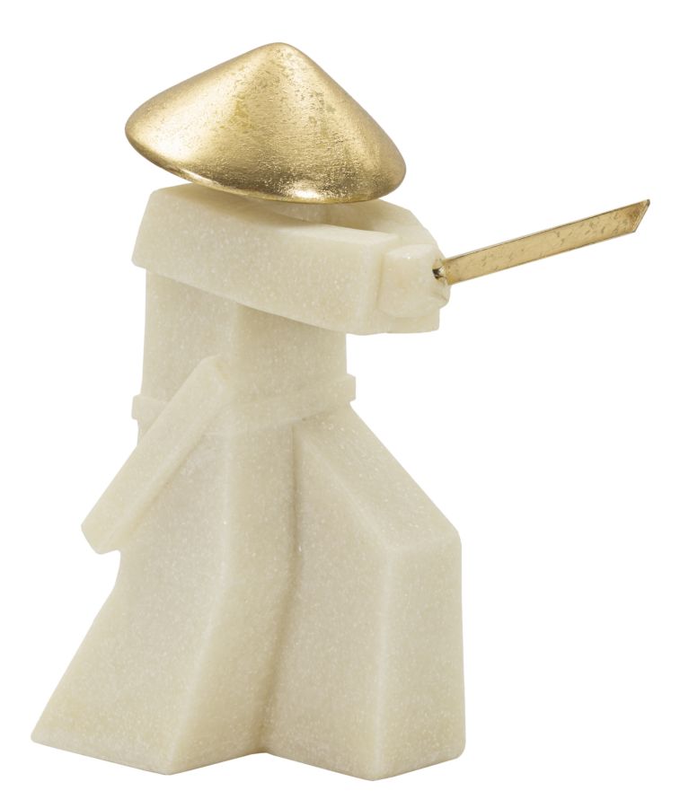Statua di samurai con cappello e spada dorati, in una dinamica posizione di difesa, ideale per collezionisti e appassionati di storia giapponese.