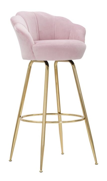 Sgabello bar rotondo imbottito in velluto sintetico con schienale con poggiapiedi in metallo dorato. La forma semplice e le linee essenziali lo rendono perfetto per essere combinato a qualsiasi tipo di arredo.