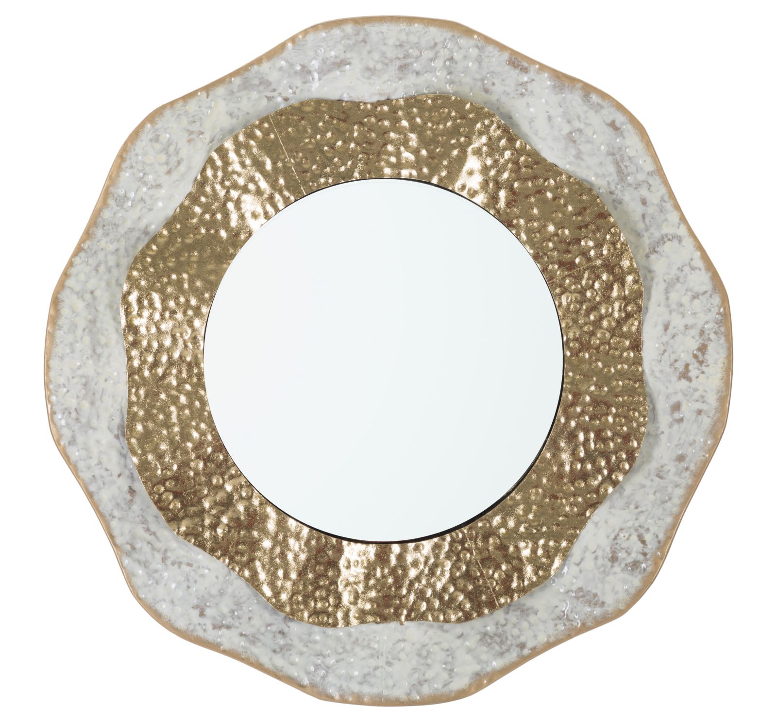 Specchio da parete con cornice in metallo. Il contrasto tra l’oro e i toni chiari insieme al design sinuoso e irregolare donano un tocco di fascino ad ogni ambiente.