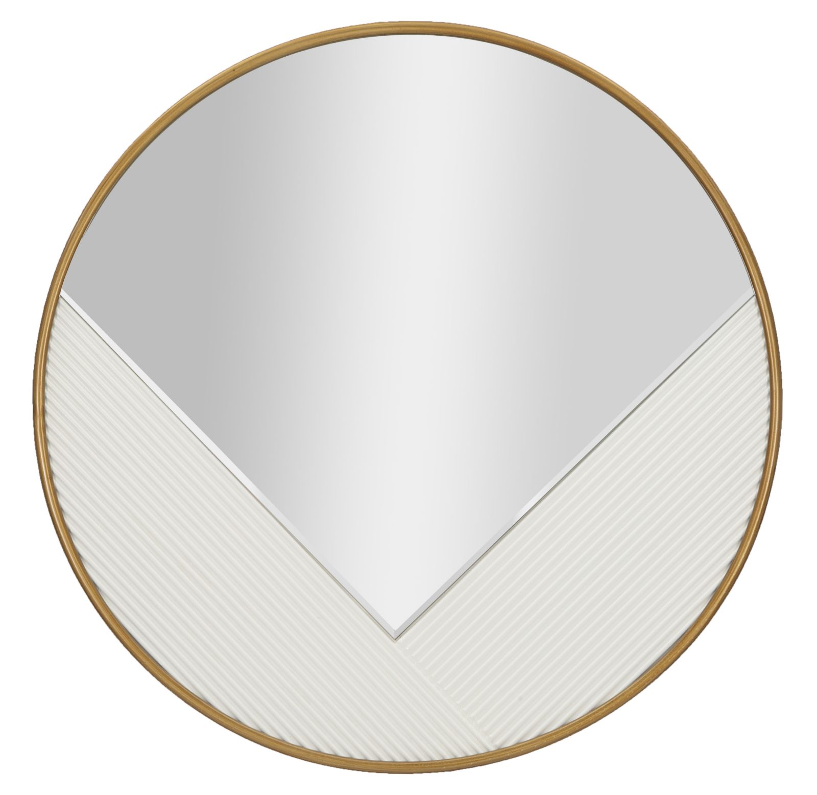 Specchio rotondo da parete con elegante decorazione in rilievo in legno e semplice cornice in metallo dorato.