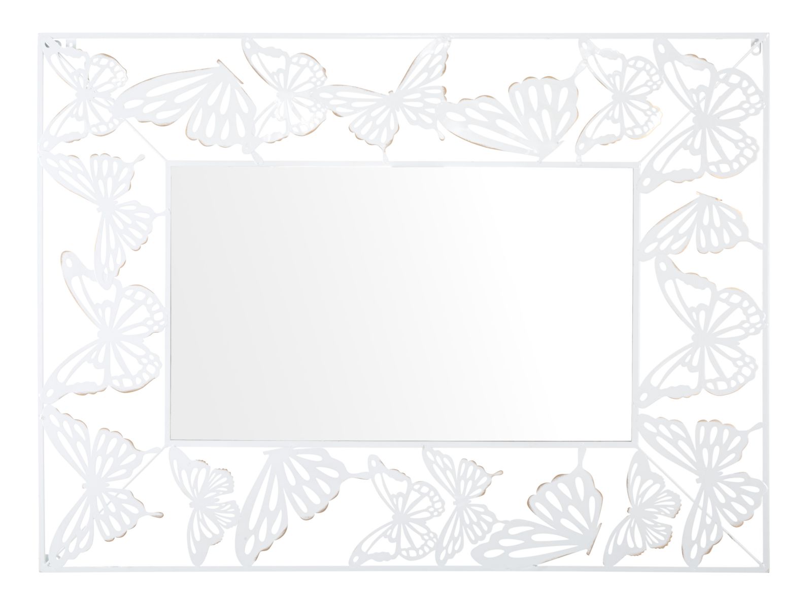 Specchio rettangolare da parete in metallo bianco. La particolare cornice realizzata con farfalle in volo intagliate dona un tocco di eleganza e leggerezza ad ogni ambiente.
