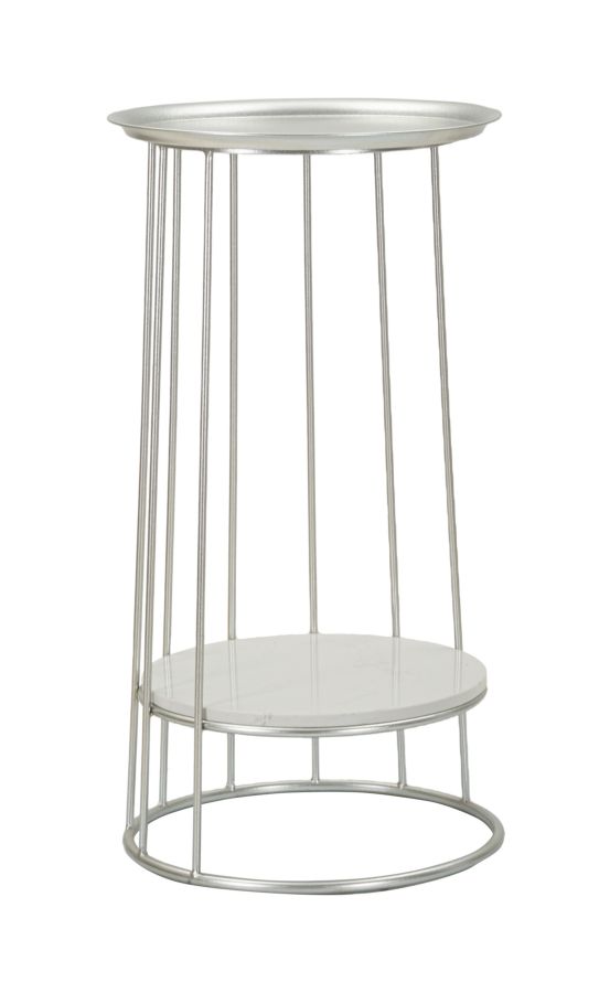 Tavolinetto elegante con base in metallo argentato e top in marmo. La base, un intreccio di linee che si incontrano, racconta una storia di connessione e armonia.