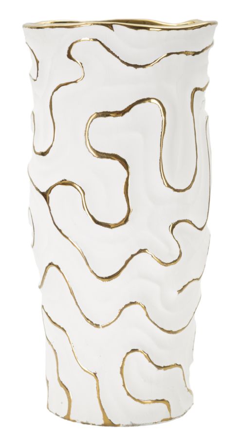 Vaso in ceramica bianca con eleganti linee dorate, ideale per un tocco raffinato e contemporaneo nell’arredamento.